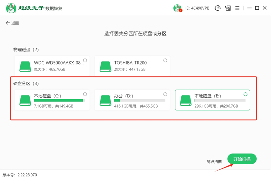 2.确定了恢复的U盘分区后,只需点击“开始扫描”,超级兔子就会开始扫描U盘的所有区域,逐一寻找丢失的数据。