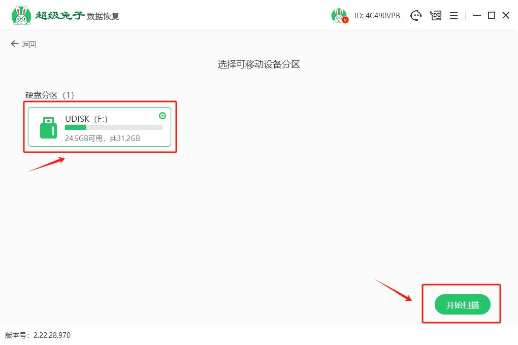 2.选择好目标U盘后,点一下“开始扫描”,超级兔子会立即运行,帮你查找丢失的文件并准备恢复。