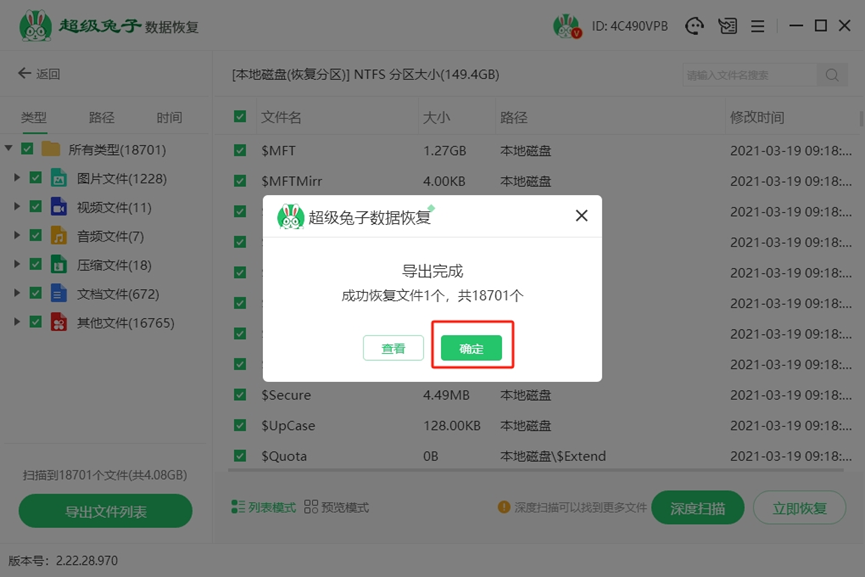 6.恢复完成后,轻轻点一下“确定”,软件会自动结束操作,所有文件都已经妥善恢复到指定位置。