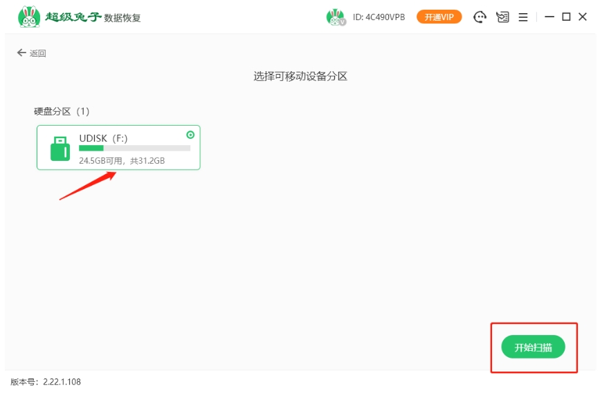 2.当你确定了需要恢复的U盘,点击“开始扫描”,软件就会启动扫描程序,自动查找丢失的数据。