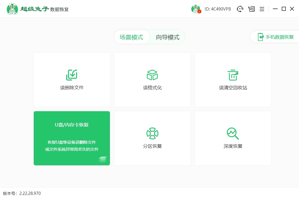 1.进入超级兔子数据恢复主界面后,找到“场景模式”,点击“U盘/内存卡恢复”,随后进行数据查找恢复。