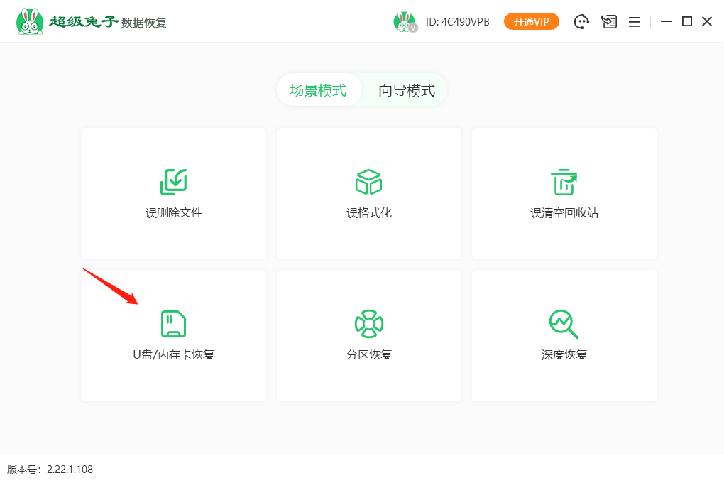 1.打开超级兔子数据恢复后进入主界面,点击“场景模式”,再选择“U盘/内存卡恢复”,接着程序会进行数据的恢复。