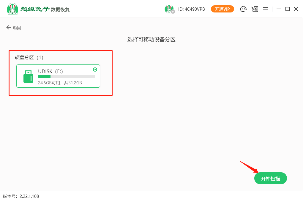 2.找到并选中设备列表中的内存卡后,点击“开始扫描”,超级兔子会开始对内存卡进行扫描。