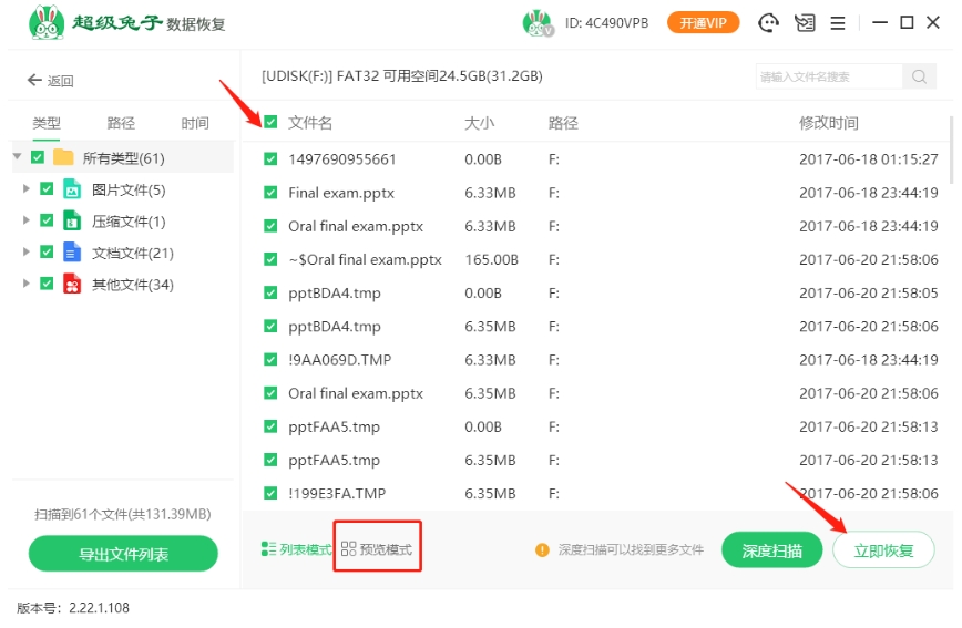 4.等全部扫描结束,可以先进“预览模式”简单检查文件是否正常,确认无误后再点“立即恢复”。