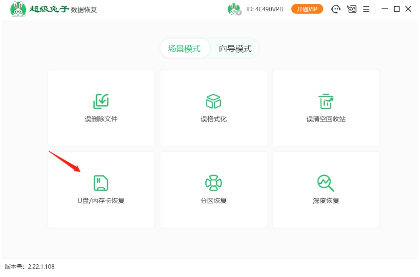 1.打开超级兔子数据恢复后进入主界面,点击“场景模式”,再选择“U盘/内存卡恢复”,接着程序会进行数据的恢复。